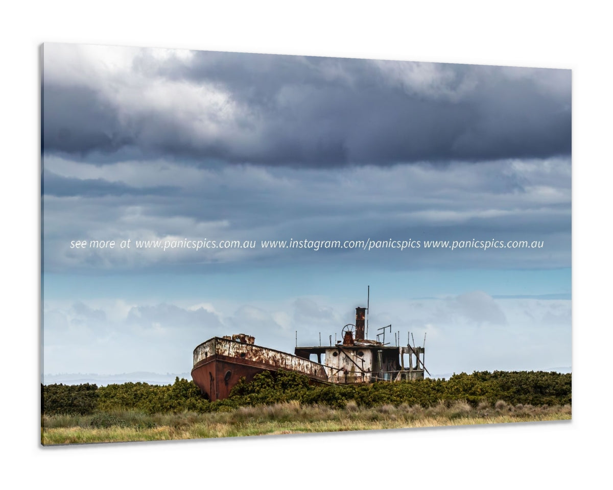 Rust-covered shipwreck on a grassy field with a dramatic sky.